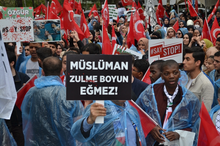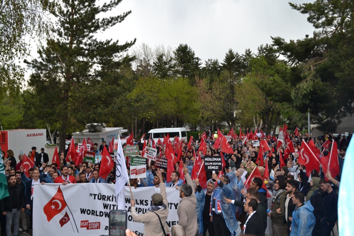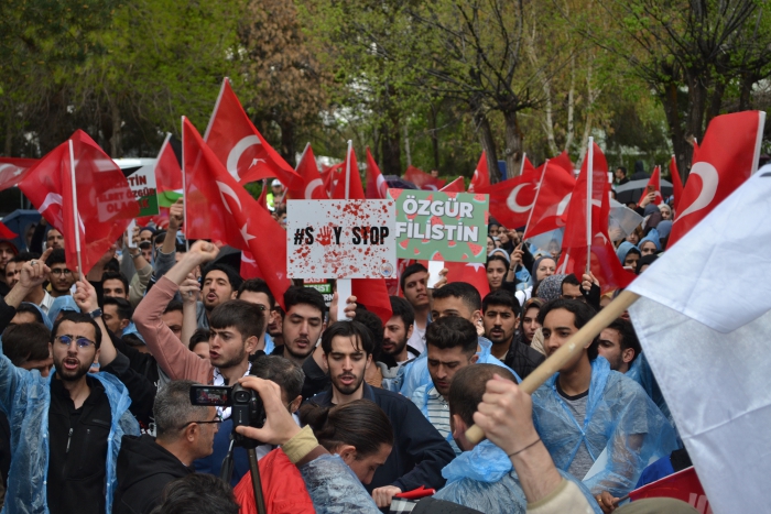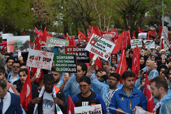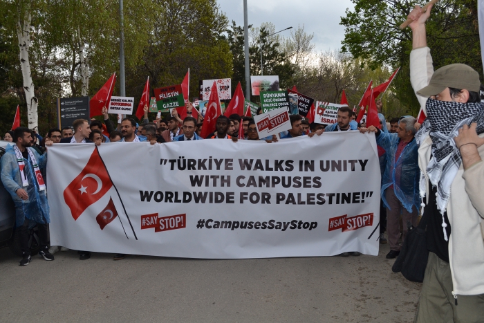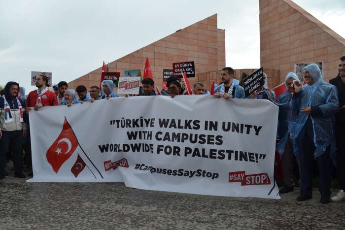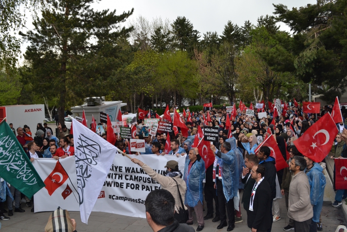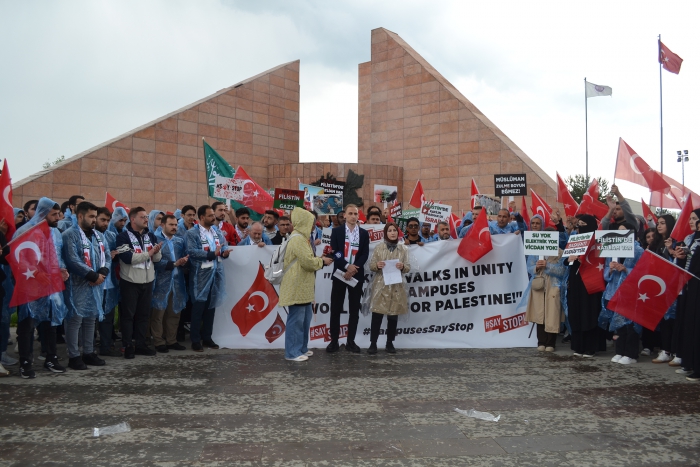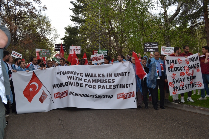 Erzurum Post- Enes TANAS'ın haberi- Erzurum Atatürk Üniversitesinde 'SayStop' adı verilen etkinlikte Gazze'de yaşanan soykırımı kınamak, Avrupa ve Amerika'da üniversitelerde yapılan eylemleri destekleme amacıyla bir araya geldi. Atatürk ve Gençlik Anıtı Meydanında bir araya gelen öğrenciler İsrail'in Gazzeye yaptığı soykırımı reddederek, Avrupa'da yapılan eylemleri destekledi. Filistin ve Türk bayrakları eşliğinde Atatürk Üniversitesi Merkezi Yemekhane önüne yürüdü. Yürüyüş sırasında Filistin lehine sloganlar atıldı.