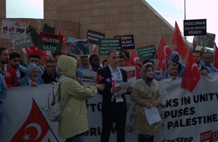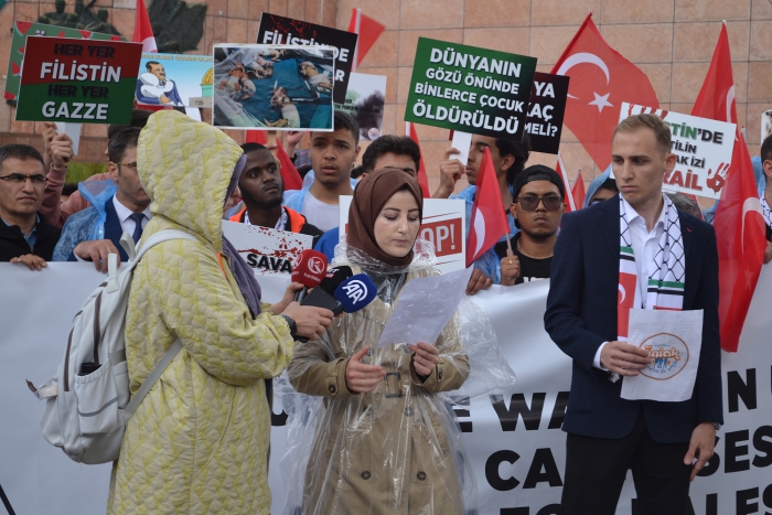 Toplu destek mesajlarının ardından basın açıklaması yapan Erzurum Ak Parti Gençlik Kolları İl Başkan yardımcısı aynı zamanda Erzurum ÜNİAK Başkanı Oğuzhan Öztürk, 209 gündür çocuk, kadın, erkek, genç, yaşlı, engelli ayırt etmeksizin 35 bin kişinin İsrail barbarlığı tarafından katledildiğini vurgulayarak, " Binlerce kişinin evinden, yurdundan göçe sürüklendiği, kundaktaki bebeklerin bombardımanlar sonucunda enkaz altında can verdiği bir soykırım yaşanmaktadır. İnsanlığın yaşadığı acıları; canı yananın rengine, dinine ve diline göre tasnif etmeyi, kınamayı ve lanetlemeyi kendisine pay bilen iki yüzlü egemen güçler ile uluslararası örgütler ise vahşet yaşatan İsrail olunca bir kez daha sessiz kalmayı, katledilen bebeklerin görüntülerine karşı gözlerini kapatmayı, masum kadınların feryatlarına karşı kulaklarını tıkamayı tercih etmişlerdir" dedi.