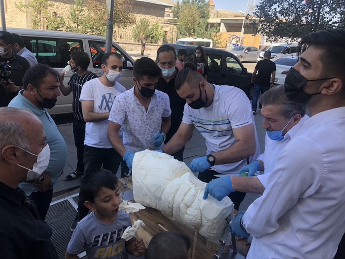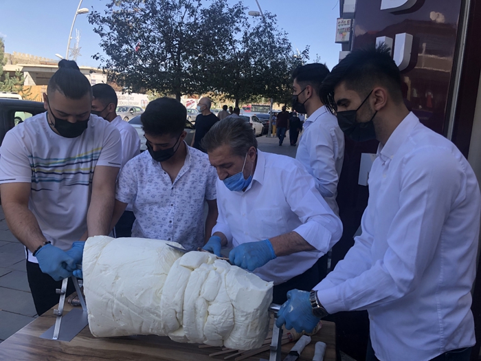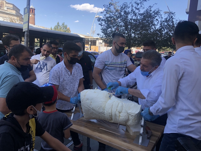 Tahta çubuklarla cağ şeklinde kestikleri dondurmayı vatandaşlara ikram eden dondurma işletmecisi Osman Kocaoğlu, “Cağ kebabı olur da cağ dondurma olmaz mı. Bu dondurma 4 saat beklese bir şey olmaz. Maraş’ın dondurması, Erzurum’dan meydan okuyoruz” dedi.