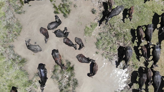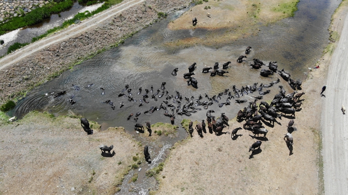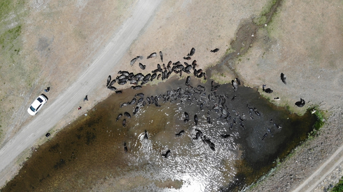 Öte yandan, Erzurum’da gün geçtikçe etkisini artıran kuraklıktan da en çok mandalar olumsuz yönde etkileniyor. Sıcak havalardan bunalan mandalar yıkanmak için su bulmaktan zorlanırken çobanlarda bu durumdan olumsuz etkilendiklerini ifade ediyor.