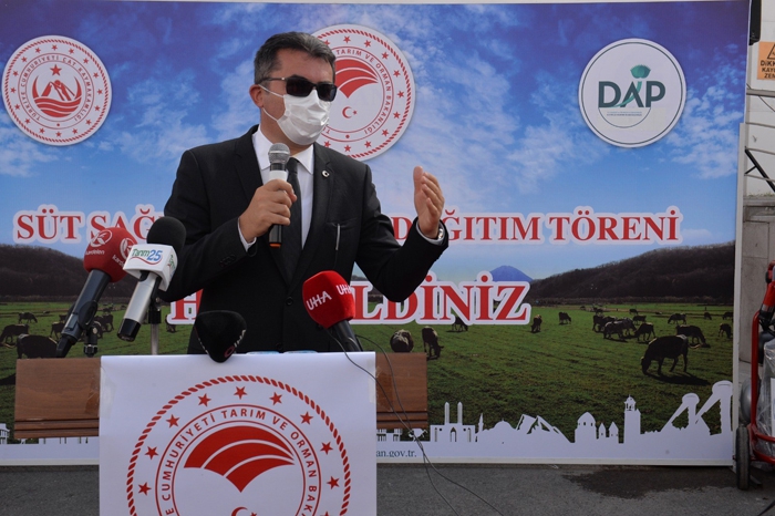 Erzurum Valisi Okay Memiş, süt sağım makinesi dağıtım töreninde yaptığı konuşmada, “Erzurum’un 2 bin rakımlı ilçesinde kurulmuş bulunan Çat ilçesi doğa olarak muhteşem bir yayla havası taşıyor. Türkiye’de en fazla meraya sahip olan il Erzurum’dur. Türkiye’deki toplam meranın yüzde 12’si Erzurum’da, bu da hayvancılık demektir. Çat ilçemizde 40 bin baş büyük havan varlığımız var ama bunu 60 bine çıkarmayı hedefliyoruz. Pamuk Eller Nasır Tutmasın projesi kapsamında o eller nasır tutsun veya tutmasın o eller öpülür.