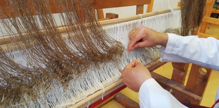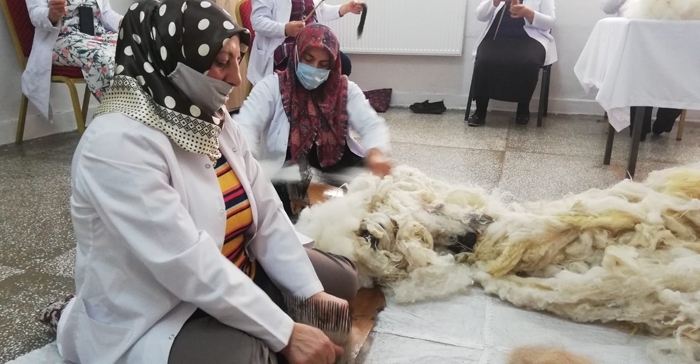 Yıkanan yünler 30 dakika kadar güneşte kurutulduktan sonra tekrar ıslatılarak tokaçlanıp tekrar kalan kirlerinden arınması sağlanıyor. Yıkanan yünler kurutulduktan sonra dişli taraklarda taranarak yöresel olarak adına "teşi" denen aletlerle inceltilerek iplik haline getiriliyor. İplik haline gelen yünler, daha sonra ehram dokuma tezgahlarındaki yerini alıyor. Tamamen ahşap ve geleneksel tezgahlarda dokunan ehramlarda desen işlemesi yapılıyor. Geçmişten günümüze kadar 100'den fazla süsleme yapılıyor.