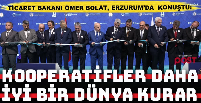 Erzurum Post-Ticaret Bakanı Ömer Bolat, Erzurum Recep Tayyip Erdoğan Fuar Merkezi’nde düzenlenen 6. Türkiye Kooperatifler Fuarının açılışında konuştu. Kooperatiflerin ekonomik kalkınmadaki rolüne dikkat çeken Bolat, “Bu yılın ilk 7 ayında 58 milyon dolar ihracat yapan kooperatiflerimizi yürekten tebrik ediyorum. Yerelden küresel üretim gücü ve ihracatla büyüyen Türkiye anlayışımızla çalışmalarımızı sürdüreceğiz.” dedi.