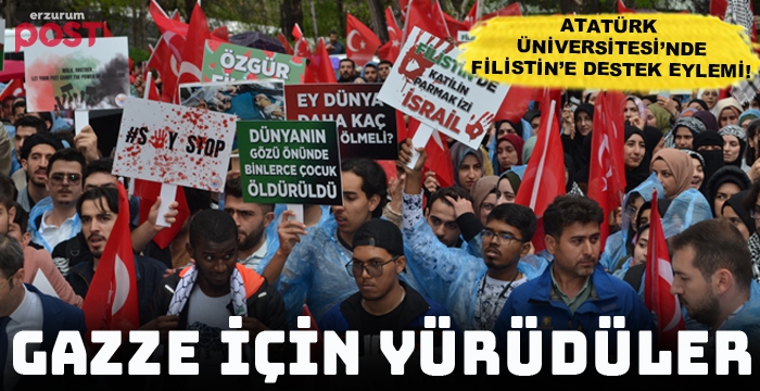 Erzurum Post- Enes TANAS'ın haberi- Erzurum Atatürk Üniversitesinde 'SayStop' adı verilen etkinlikte Gazze'de yaşanan soykırımı kınamak, Avrupa ve Amerika'da üniversitelerde yapılan eylemleri destekleme amacıyla bir araya geldi. Atatürk ve Gençlik Anıtı Meydanında bir araya gelen öğrenciler İsrail'in Gazzeye yaptığı soykırımı reddederek, Avrupa'da yapılan eylemleri destekledi. Filistin ve Türk bayrakları eşliğinde Atatürk Üniversitesi Merkezi Yemekhane önüne yürüdü. Yürüyüş sırasında Filistin lehine sloganlar atıldı.